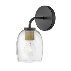 This sconce's transitional style rings loud and clear with clever bell-shaped clear glass designed to highlight its distinctive industrial detailing, all while serving up ample illumination. Easily installed up or down, it transforms any bathroom into one of the most stylish spots in the house. A collection of 3 versatile finish options, Antique Nickel, Black and Lacquered Brass, lets you pick the perfect finish for powder rooms and primary baths alike.