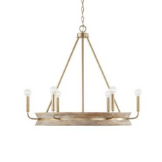 Effortlessly blending Matte Brass with white-washed mango wood, this chandelier creates a sophisticated aesthetic. The circular form and crisp angles add elegant dimension to this classic style.