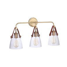 Constructed from solid brass in our vintage brass or polished nickel finish featuring crystal clear glass suspended from genuine leather, this collection is an instant classic that makes a statement. The clean design can easily be paired with many of our other Gallery Collection pieces or stand alone.