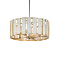 Classic in form and evoking the sea, laminae of Capiz shell are framed in paneled drum shapes. The Natural Aged Brass finish refines the coastal elements and complements the warm glow from behind the translucent panels. Available in multiple configurations of pendants as well as tiered chandeliers as well as a tall ADA-compliant wall sconce, the collection offers a sophisticated approach to coastal design.