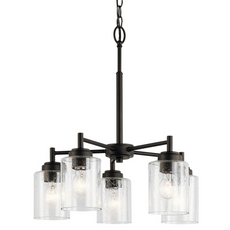 This modern chandelier in an Olde Bronze finish with Clear Seeded glass shade pair beautifully with the linear arms, bringing light and dimension to a space. Can hang as an uplight or downlight for extra versatility.