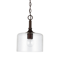 This simple pendant with elongated finial is versatile in style and size. The 10 inch wide seeded glass provides a subtle texture. Available in Brushed Nickel, Matte Black or Bronze.